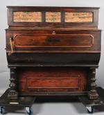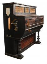 Piano mécanique espagnol à manivelle à dix airs, avec liste marquée : "Pianos à Manubrio, Benito Vela, Pueblo Espagnol". Barcelone. 5 timbres. Bon état (à accorder). L. 125 cm. P. 60 cm. H. 127 cm.