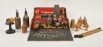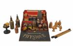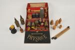 "Physique", beau coffret à étages de prestidigitation de salon avec nombreux accessoires en laiton, zinc, bois, important nombres d'objets complémentaires en bois tourné et deux personnages "Jean de La Vigne".