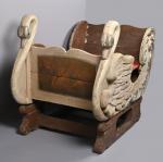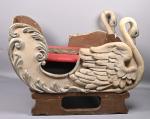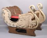 Gondole de manège aux cygnes complète : devant avec tête de cygne, ailes sur les côtés, arrière à décor de volutes et feuillages. Anciennement peinte crème et argent. L. 125 cm. Larg. 81 cm. H. 102 cm.