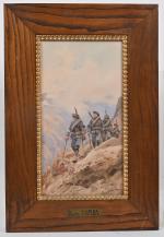 Pierre COMBA (1859-1934) Chasseurs alpins aquarelle signée en bas à droite. Dans un cadre avec cartouche. Vue : 34 x 18 cm.