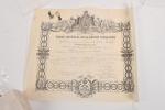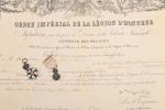 France Ordre de la Légion d'honneur. Étoile en réduction de Chevalier, époque IInd Empire. Argent, émail (éclats), SR. Avec diplôme de Chevalier, sur parchemin, au nom de Kun Victor, Maître Charpentier, en date du 12 mars 1856. On joint un insigne miniature de l'Ordre du Lys. Argent, ruban. Et un écrin de Fraisse-Demey Paris.