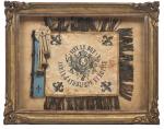 Fanion rectangulaire, en toile blanche, imprimé à motif des trois fleurs de lys, couronnées sur attributs militaires, marqué en exergue « Vive le Roy, Armée Catholique et Royale », et aux angles d'une fleurs de lys. Bordé d'un galon et franges dorés. Au guindant, une bande bleue, imprimé de fleurs de lys, avec quatre anneaux. Avec cocarde blanche, garnie d'un bouton à fleur de lys et trois cravates blanches, garnies de galons et franges dorés, manuscrit sur celle du dessus « Fidélité ». Encadré sous verre, manuscrit au dos, dans un cartel « Souvenir de la Révolution, Drapeau de l'Armée Catholique et Royale, Don de Mr le Comte Charles de Brimon - Beauchène ». (mouillures)