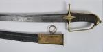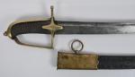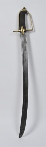 Sabre de Cavalier léger. Poignée recouverte de basane, avec filigrane. Monture en laiton. Calotte à longue queue. Garde à une branche, marqué en dessous « AV 59 », oreillon en navette et quillon droit. Lame courbe, raccourcie, à gouttière. Fourreau en cuir, à deux garnitures en laiton, découpé, décoré au trait. EM époque fin XVIIIè siècle (usures, piqûres).