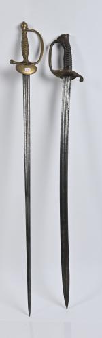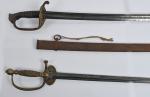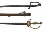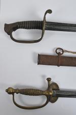 Sabre d'Adjudant, modèle 1855. Garde à une branche et coquille ajourée, en laiton. Lame courbe. Fourreau en fer. Dans l'état On joint un restant d'épée de fonctionnaire.