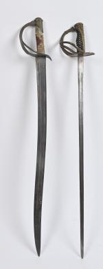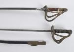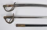 Lot de 2 sabres de panoplie. Gardes à quatre et trois branches, en laiton, ciselé. Un fourreau recouvert de cuir. Dans l'état (usures, piqûres, manque la bouterolle).
