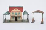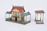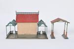 F.V, gare avec deux auvents en tôle peinte, principalement vert, rouge et crème. 31 x 14 cm. On y joint une petite halte. Bel état.