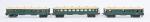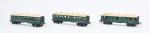 L.R, rame de trois voitures à boggies verte, toit crème, SNCF : deux voyageurs (32 cm) et fourgon (27 cm). Bel état.