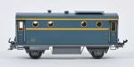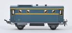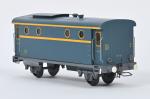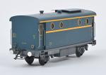 RV Zéro, wagon SNCF de service à essieux, bleu à filet jaune. Très bel état. 23 cm.
