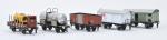 Buco, 5 wagons de marchandises à essieux, l. 18 cm : Kühlwagen (frigorifique) Bell, à ridelles, fourgon à plateforme, tombereau et citerne Esso.
