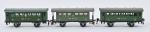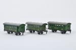 Buco, 3 voitures voyageurs SBB CFF mixte 2e/3e classe vertes dont une plateforme, (petites usures). 20 cm.