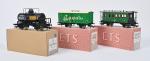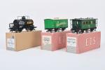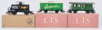 ETS, 2 wagons et voiture à essieux, l. 20 cm en boîtes : citerne Marcel Millet Shell, fourgon Budvar et voiture CSP mixte 2e/3e classe.
