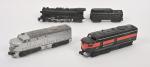 Lionel écart. O, locomotive électrique type 232 noire, avec tender plastique à boggies Lionel Lines. On y joint deux éléments de bloc diesel : Union Pacific grise et Rock Island noir et rouge.