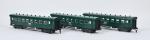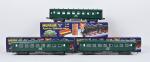 Merkur contemporain écart. O, trois voitures à boggies, SNCF, vertes, type A4B, A8 et B8. Bel état, en boîte. 38,5 cm.