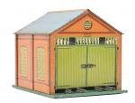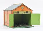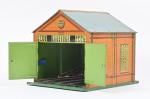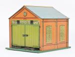 Hornby, petite remise à deux voies mécaniques, lithographiée. Bel état. 23 x 27 cm.