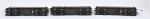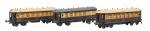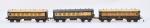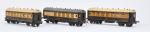 Hornby, trois voitures Pullman à boggies de la rame Flèche d'Or, marron et crème dont Arcadia avec éclairage, (état d'usage), rouille).
