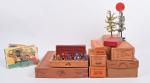 Hornby, accessoires et wagons en boîte : gare démontable n°19, passerelle, quai, wagon couvert, wagon plat, fourgon, signaux, personnages...