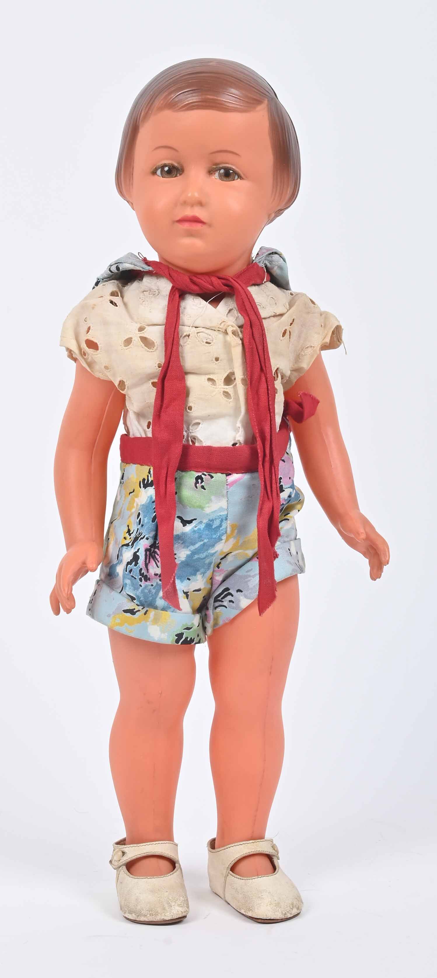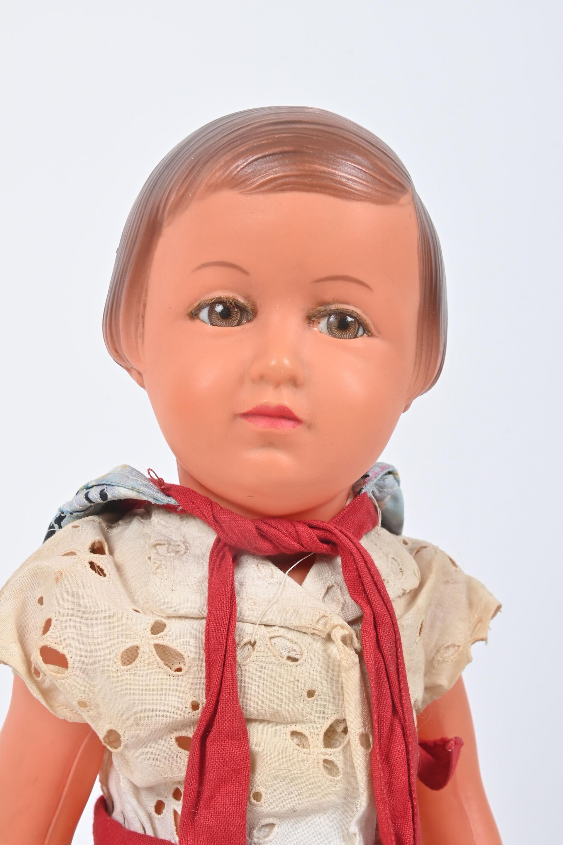 SNF, Josette taille 39 Poupée en celluloïd, yeux en acétate marron, chevelure châtain modelée, corps semi-articulé, habits artisanaux. 38 cm.
