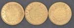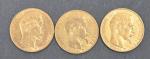 Trois pièces 20 Francs or Napoléon III tête nue 1856 (2) et 1858 (1). Vendue sur désignation. Frais acheteur réduit à 14.28 % TTC.