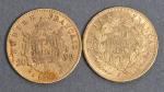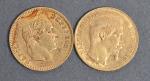Deux pièces 20 Francs or Napoléon III tête nue 1859 (1) et Napoléon III tête laurée 1863 (1). Vendue sur désignation. Frais acheteur réduit à 14.28 % TTC.