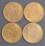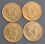 Quatre pièces 20 Francs or Napoléon III tête laurée 1866. Vendue sur désignation. Frais acheteur réduit à 14.28 % TTC.