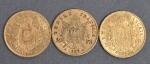 Trois pièces 20 Francs or Napoléon III tête laurée 1867. Vendue sur désignation. Frais acheteur réduit à 14.28 % TTC.