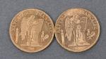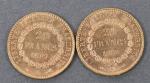Deux pièces 20 Francs or Génie 1887 (1) et 1892 (1). Vendue sur désignation. Frais acheteur réduit à 14.28 % TTC.
