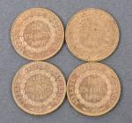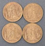 Quatre pièces 20 Francs or Génie 1896 (3) et 1898 (1). Vendue sur désignation. Frais acheteur réduit à 14.28 % TTC.