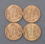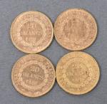 Quatre pièces 20 Francs or Génie 1897. Vendue sur désignation. Frais acheteur réduit à 14.28 % TTC.