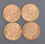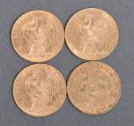 Quatre pièces 20 Francs or au coq 1909. Vendue sur désignation. Frais acheteur réduit à 14.28 % TTC.