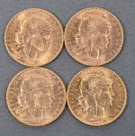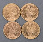 Quatre pièces 20 Francs or au coq 1910. Vendue sur désignation. Frais acheteur réduit à 14.28 % TTC.