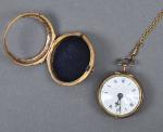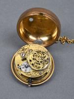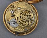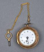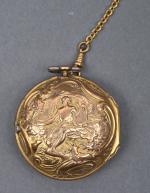 Montre de gousset en pomponne, à double boîtier de forme ronde, uni, cadran blanc, chiffres arabes et romains, aiguilles fleurdelisées. Mouvement mécanique à coq et échappement à verge à remontage à clef (en l'état). Double boîtier en pomponne ciselé d'une scène antique, allégorie de la musique. Mouvement signé Charleson London. Avec une chaîne de montre et une clef en laiton. Usures marquées et bosses.