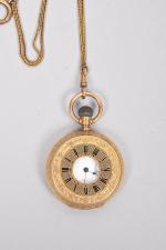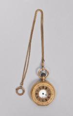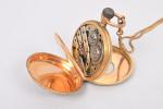 à double boîtier, ciselés et émaillé, le couvercle ouvert permettant de lire l'heure. Cadran blanc, chiffres arabes et romains, aiguilles poire, trotteuse à 6h. Mouvement mécanique à remontage manuel en l'état (bloqué). Munie de sa chaîne à maille colonne double. Longueur de la chaîne : 30 cm. Diamètre du boîtier : 4,80 cm. Poids brut : 100,50 g.