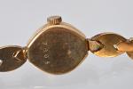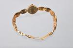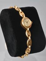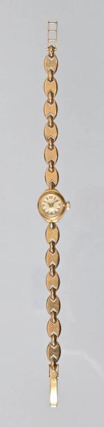 MATY Besançon Montre bracelet de dame en or jaune 18K 750 millièmes, boitier rond à fond champagne , chiffres arabes et index, mouvement mécanique, bracelet à mailles rigides articulées. Poids brut : 18,40 g.