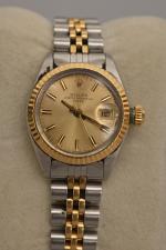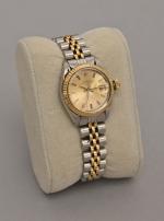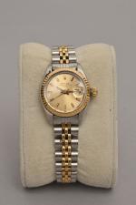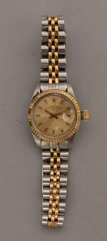 Montre de poignet pour dame en acier et or jaune 18K 750 millièmes, de forme ronde, cadran doré, index et aiguilles bâtons, guichet dateur à 3h, trotteuse centrale. Mouvement mécanique à remontage automatique, en l'état (semble fonctionner).