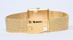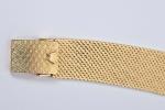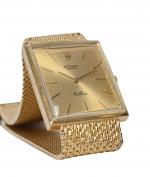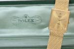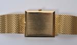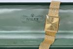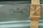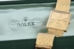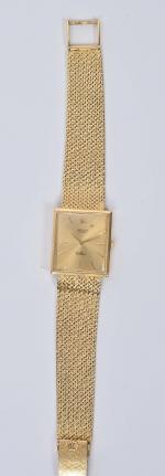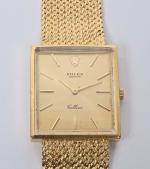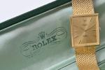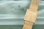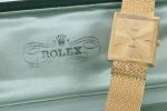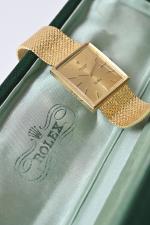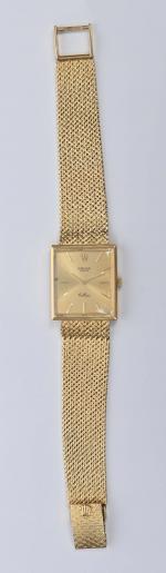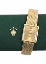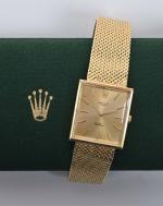 Montre de poignet pour homme en or jaune 18K 750 millièmes, boîtier de forme rectangulaire, cadran doré, aiguilles et index bâtons. Mouvement mécanique calibre 1600 à remontage manuel, en l'état, semble fonctionner. Bracelet en or jaune maille tissu polonais texturé. Fermoir à clapet. Mouvement signé. Boîtier signé et numéroté 3641-145-603 J. Dim. du boîtier : 23 x 27 mm. Longueur du bracelet : 18,40 cm. Dans son écrin. Avec garantie ROLEX et facture de révision par ROLEX en 2000. Traces d'usage. Poids brut : 62,42 g.