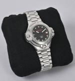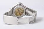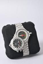 Montre modèle "Paris Dakar" en acier brossé, lunette à chiffres arabes, cadran à fond noir et index, avec guichet dateur, le cadran amovible découvrant une boussole, boîtier numéroté 732 1.049.2.0.04, bracelet à boucle déployante. Diamètre avec lunette : 3.2 cm.
