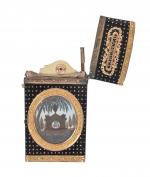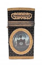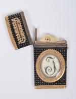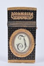 paré de deux miniatures en cheveux l'une représentant un monument sentimental garni d'un cartouche chiffré, l'autre représentant une initiale, sur le couvercle deux phylactères « souvenir et d'amitié ». A l'intérieur un carnet composé de trois feuilles. Poinçon de décharge fin 18e (non identifiable). Muni de son crayon. Dim. 4,90 x 7 x 0,70 cm. Poids brut 57,30 g.