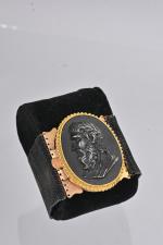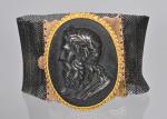 Bracelet manchette en mailles tissées métalliques avec médaillon en acier, le fermoir en métal doré sertie d'un médaillon en métal à décor en haut relief d'un profil d'homme barbu. Travail fin XIXe.