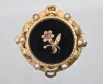 parée d'un onyx clouté d'une fleur, dans un entourage de demi-perles de culture. Pouvant faire médaillon par un système à charnière. Accidents. Diam. 2,90 cm. Poids brut : 10,20 g.