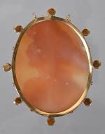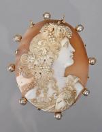 Pendentif en or jaune 18K 750 millièmes, de forme ovale, paré d'un camée sur coquille représentant une bacchante, dans un entourage de demi-perles. Traces d'usage.