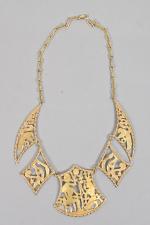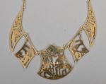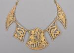 plastron, composé de cinq plaques articulées et repercées de scènes égyptiennes dont au centre « Un pharaon faisant une offrande au dieu Thot ». Fermoir mousqueton. Travail égyptien, vers 1980. Longueur : 40 cm. Hauteur du motif central : 5 cm. Poids : 44,50 g.
