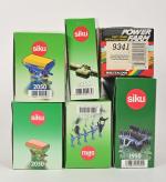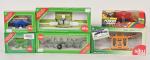 échelle 1/32ème : six outils agricoles en boîte (petites usures) : charrue Braban réf. 2051, épandeur d'engrais réf. 2050 (2 ex, variantes), remorque épandeuse réf. 9341, herse circulaire repliable réf. 1950 et tondeuse à grande couverture réf. 2265.
