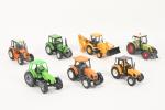 6 tracteurs agricoles échelle 1/32ème dont tracteur Claas, Deutz (x2), Renault (x3). On y joint un engin de chantier JBC. Petites usures.