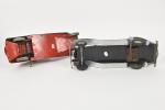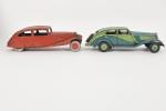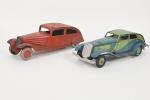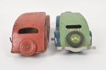 France, ML, deux conduites intérieures mécaniques, en tôle, l'une rouge, l'autre lithographiée verte et bleue immatriculée 4022 87, état grenier, l. 35 cm.