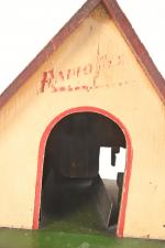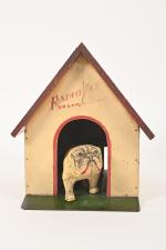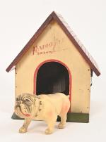 Radiorex, bouledogue en celluloïd dans sa niche en bois avec mécanisme à revoir, h. 18 cm (usures et acc. à une patte).