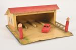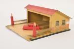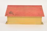 Kibri, garage en tôle peinte, n°32 et 35 avec une voiture en pastique rouge, 23 x 23 cm, usures.