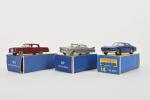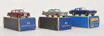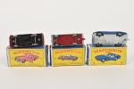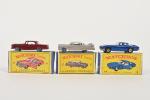 Matchbox Series, Lesney, trois voitures 1/72e en boîtes (petites usures) : _ n° 53 Mercedes-Benz coupé bordeaux, _ n° 14 Iso Grifo, _ n° 27 Cadillac Sedan bi-colore métallisée toit rose.