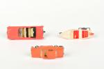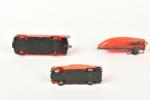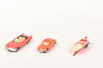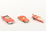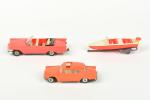 NOREV, Chrysler New-Yorker et Peugeot 404 roses en plastique, et canot avec remorque (petites usures).