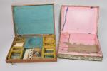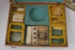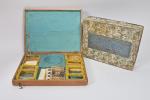 Coffret en bois contenant jeu de cartes, jetons de trois couleurs. Fin XIXe. On y joint un coffret "Décalcomanie" (vide).