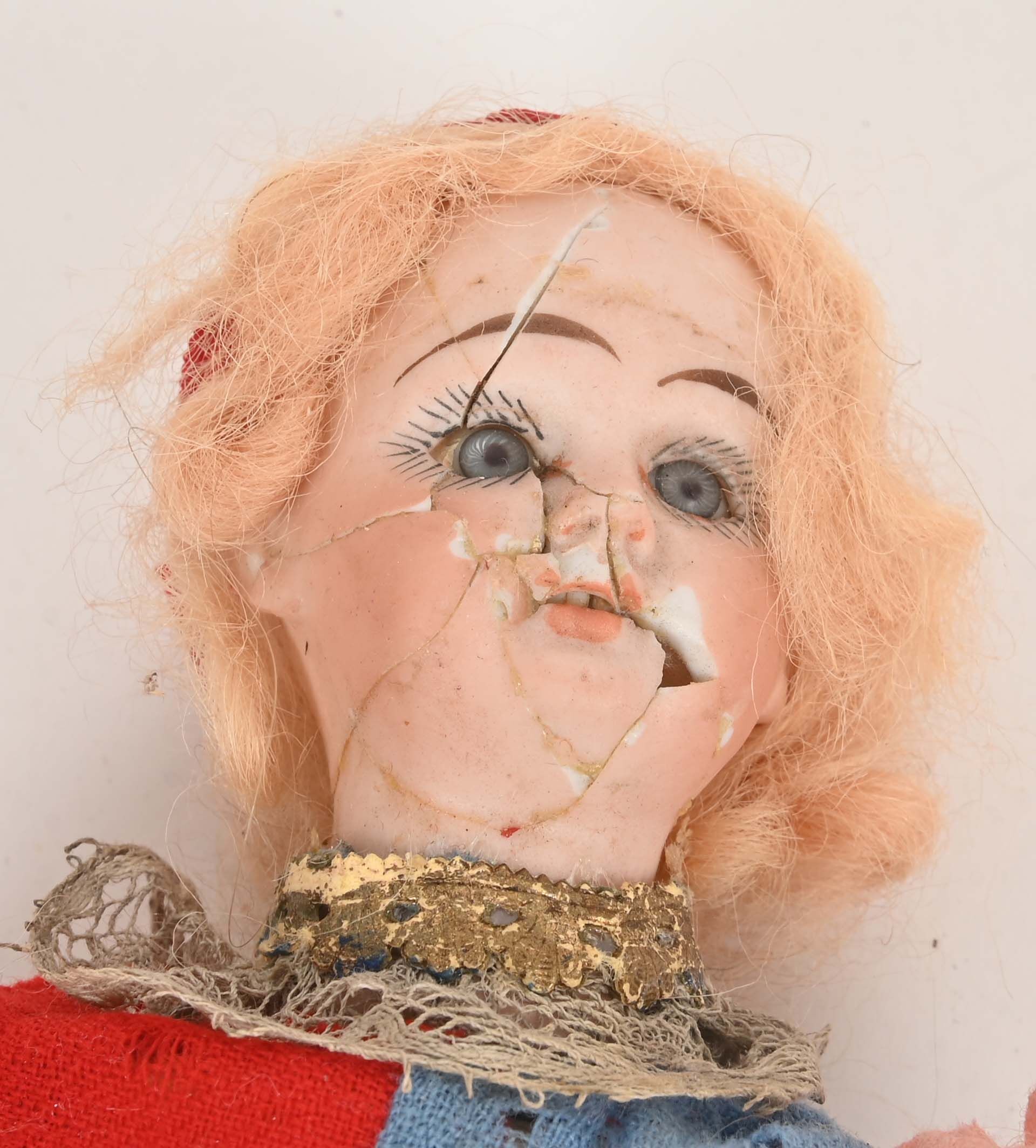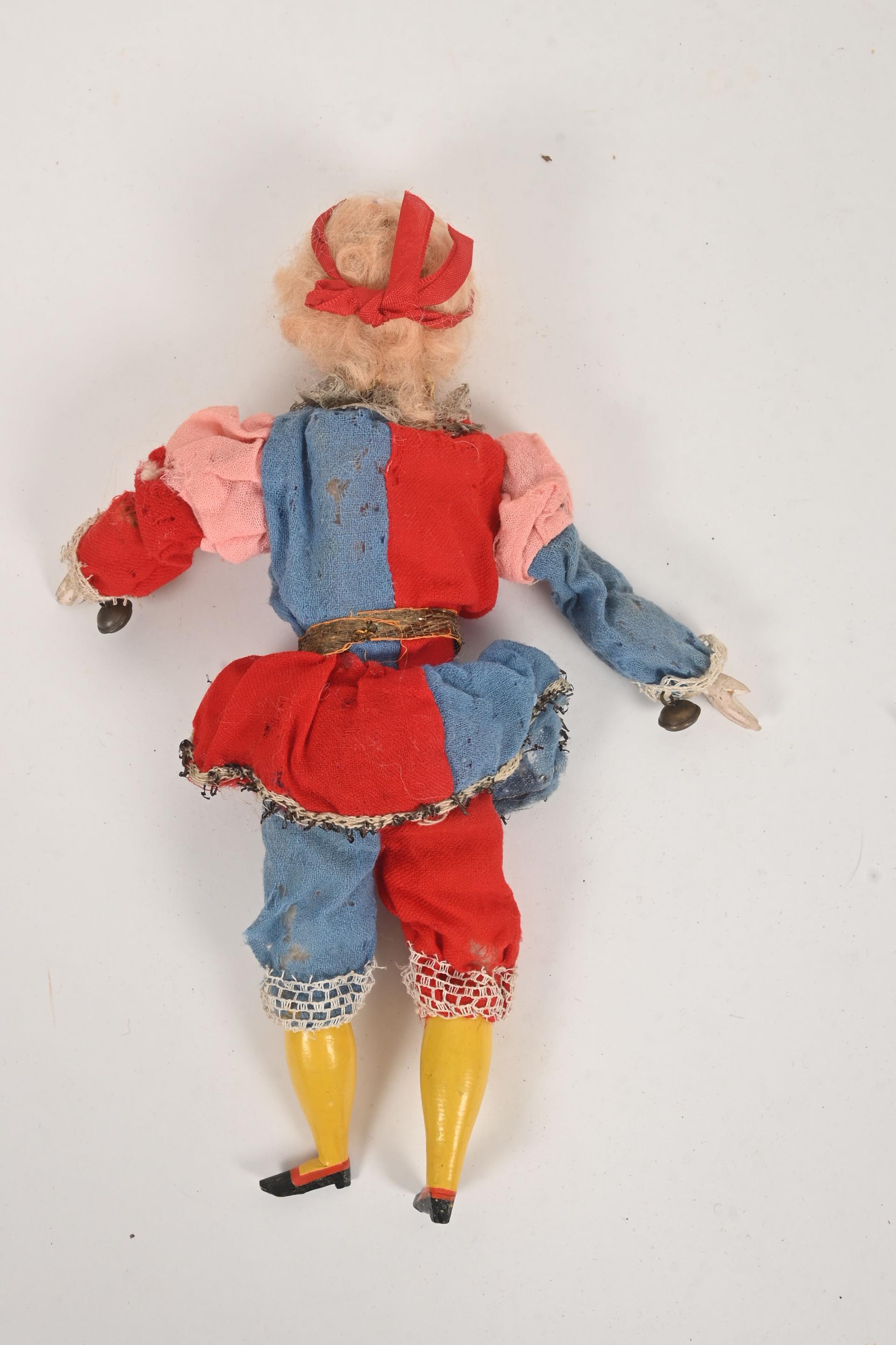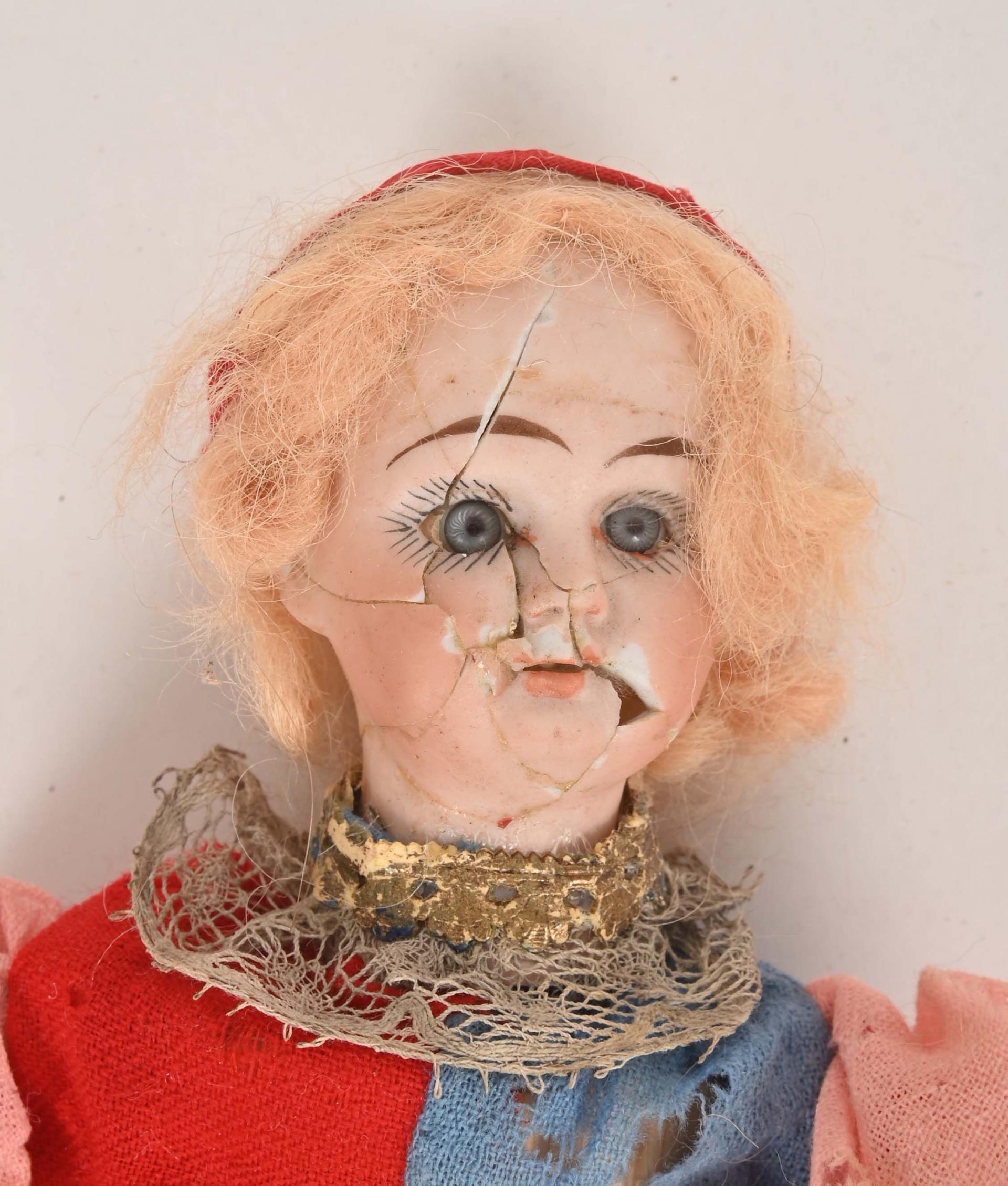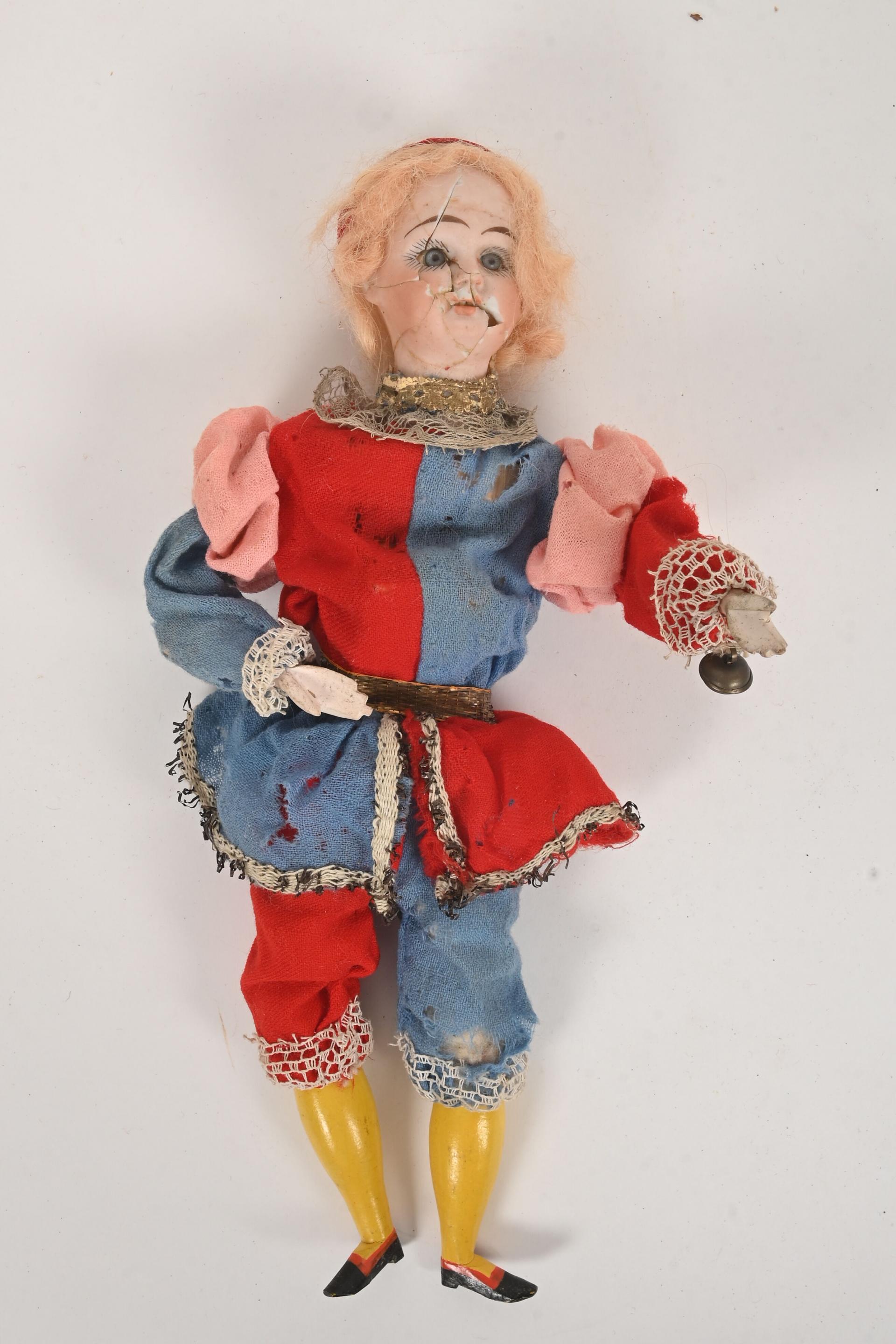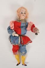 Clown avec animation sonore par poussoir sur le ventre, tête porcelaine (accidents et manques). 27 cm.